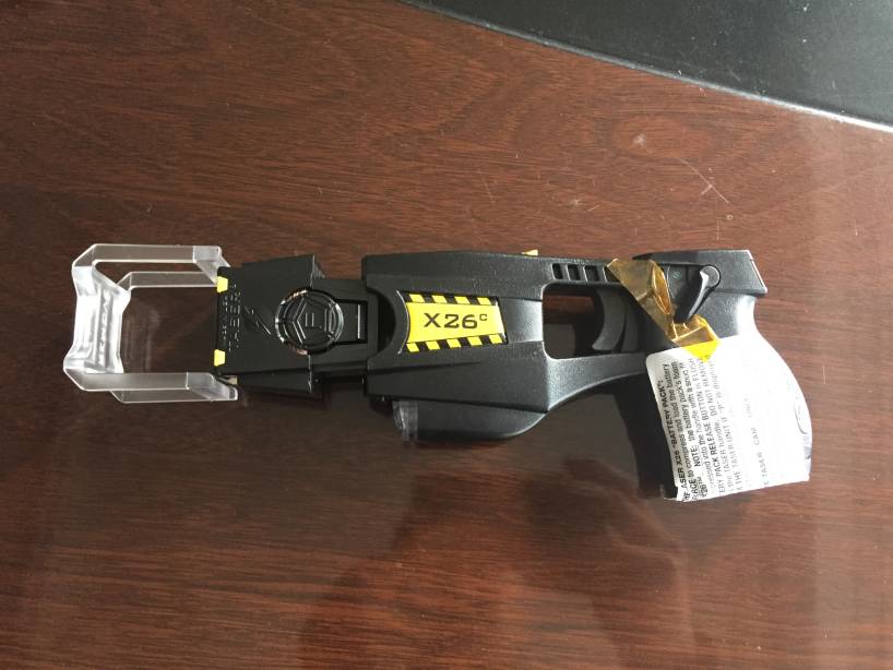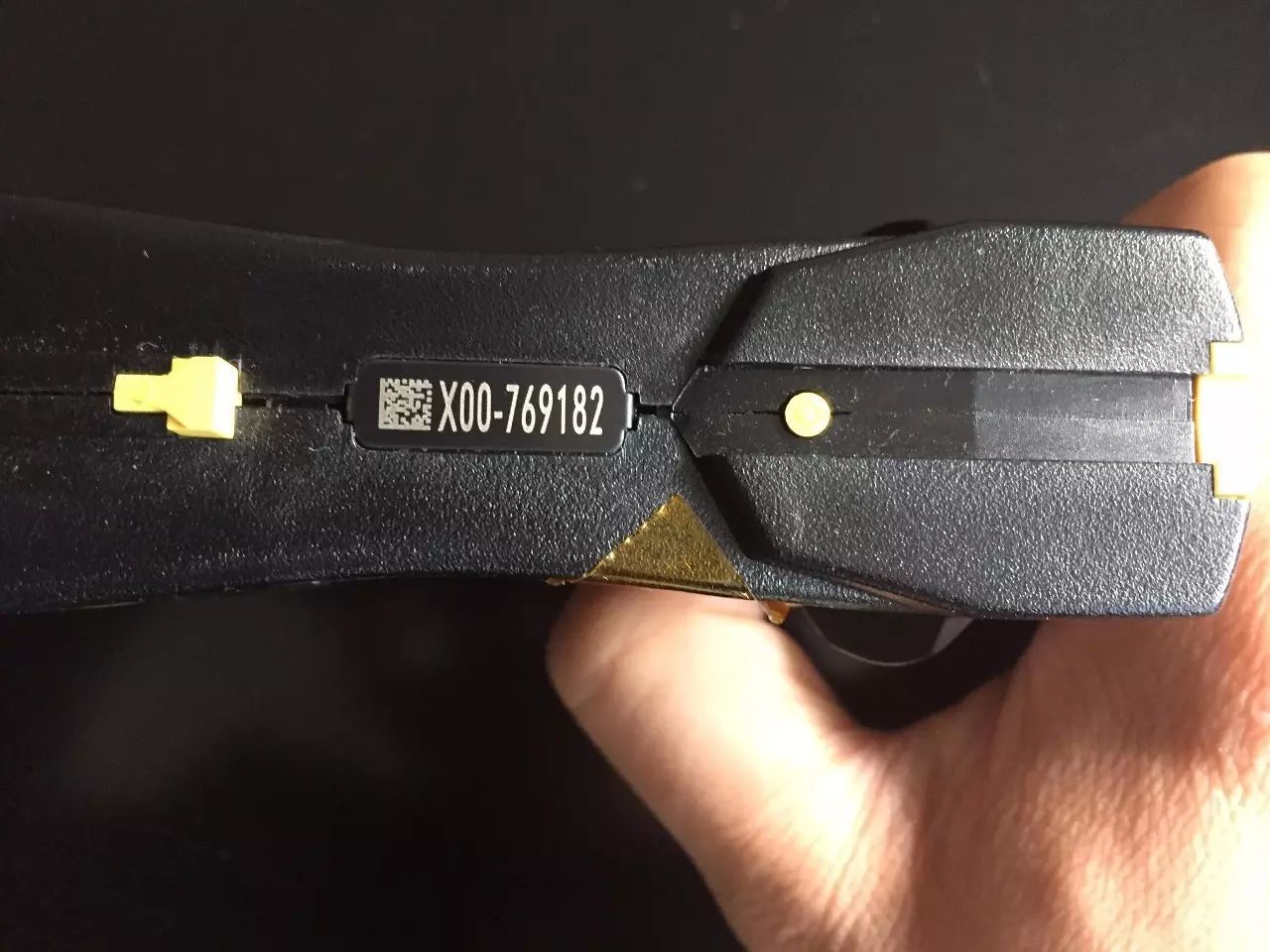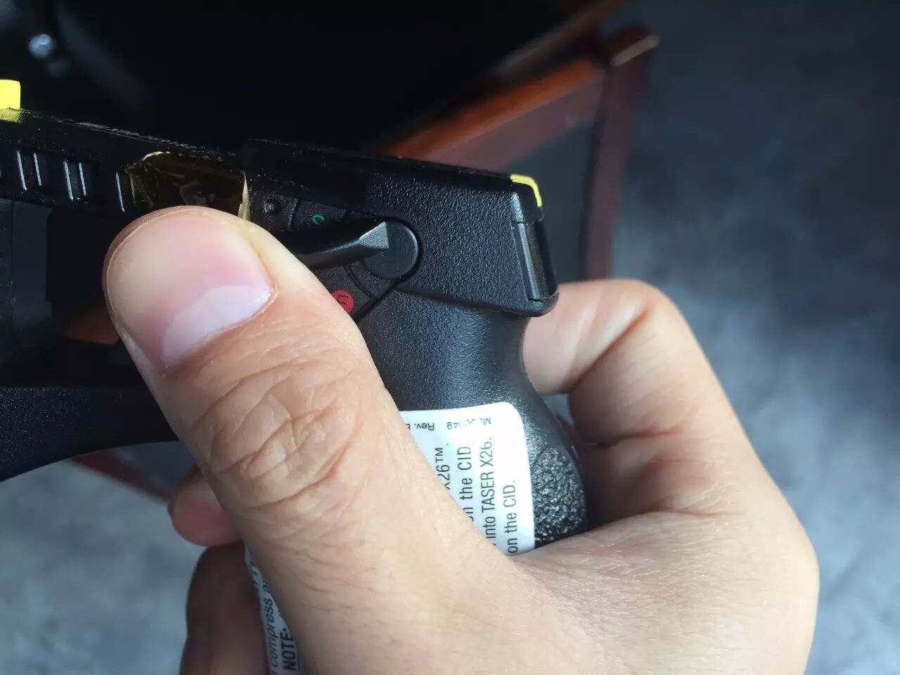 泰瑟枪X26的外包装。每支枪配5~6发弹。这是小警君的不要流口水。去除弹体上的保护壳,将子弹压入弹仓。 将保险推至绿色“S”档,做好发射准备。小警君的手指甲有太阳。 瞄准,发射。上面显示的数字为剩余发射次数。 击中目标并放电后,可扣动扳机来控制电击。